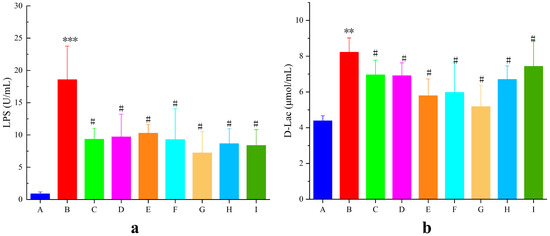 The intestinal mucosa is a key factor in the development of UC. When the intestinal mucosal barrier is compromised, bacteria and their metabolites invade the intestines and bloodstream, resulting in an increase in D-Lac and LPS levels. As shown in Figure 10a,b, LPS and D-Lac levels in the model group were significantly elevated by 95.30% and 46.67%, respectively (p < 0.01), compared with those in the blank group, suggesting impairment of the intestinal mucosal barrier in mice with UC. LPS and D-Lac activity in the AB4-ISG, HP-β-CD-AB4-ISG, and SC-AB4-ISG groups decreased (p < 0.05) compared with that in the model group. These results indicated that AB4-ISGs ameliorate DSS-induced intestinal mucosal damage in UC mice.