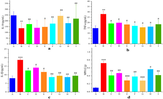 Statistical mean fluorescence intensity of (a) IL-10, (b) TNF-α, (c) IL-1β, and (d) MPO. A: Blank group, B: model group, C: positive group, D: AB4-ISG low-dose group, E: AB4-ISG high-dose group, F: HP-β-CD-AB4-ISG low-dose group, G: HP-β-CD-AB4-ISG high-dose group, H: SC-AB4-ISG low-dose group, and I: SC-AB4-ISG high-dose group. Compared with the blank group, ** p < 0.01, and *** p < 0.001; compared with the positive group, # p < 0.05, ## p < 0.01, and ### p < 0.001.