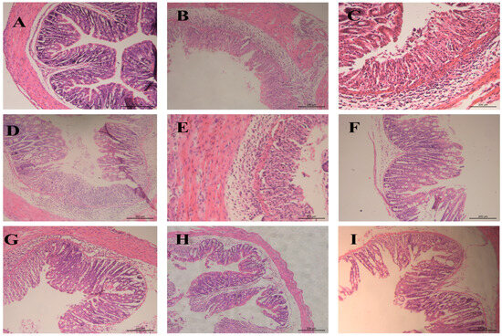 The typical histopathological examination staining photos of the colon section. (A): Blank group, (B): model group, (C): positive group, (D): AB4-ISG low-dose group, (E): AB4-ISG high-dose group, (F): HP-β-CD-AB4-ISG low-dose group, (G): HP-β-CD-AB4-ISG high-dose group, (H): SC-AB4-ISG low-dose group, and (I): SC-AB4-ISG high-dose group.