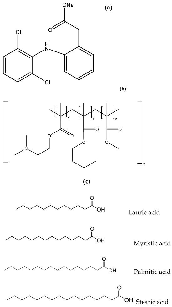 Chemical structures of (a) diclofenac sodium, (b) Eudragit EPO and (c) fatty acids used to formulate the polyelectrolyte complex microparticles.