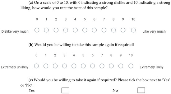 Methods applied to collect participant response in the taste assessment of the polyelectrolyte complex formulations. (a) Numeric 11-point scale to assess sample taste acceptability, which ranges from 0 = dislike very much to 10 = like very much. (b) Numeric 11-point scale to assess willingness to take the sample again, which ranges from 0 = extremely unlikely to 10 = extremely likely. (c) Binary response to assess willingness to take the sample again, recorded as a Yes/No response.