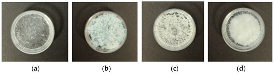 Appearance of diclofenac–Eudragit EPO–fatty acid (DS–EE–FA) complexes after 1 day of storage at room temperature post-production. Formulations were prepared with (a) lauric acid (DS-EE-LA), (b) myristic acid (DS-EE-MA), (c) palmitic acid (DS-EE-PA), and (d) stearic acid (DS-EE-SA).