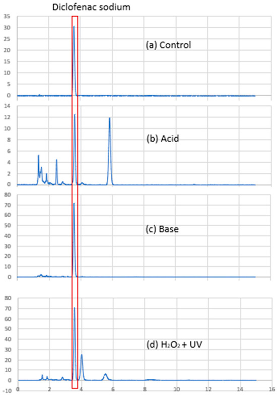 Chromatograms of diclofenac sodium (DS): (a) DS without treatment; (b) DS after 1 h heating at 100 °C in 1.0 M HCl; (c) DS after 1 h heating at 100 °C in 1.0 M NaOH; and (d) DS after 1 h exposure to UV light in 30% (v/v) hydrogen peroxide.