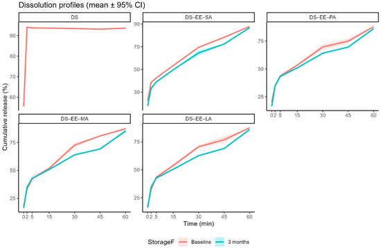 Storage for 3 months at ambient conditions retarded the release of DS from the four PEC microparticles. The mean time for 80% of the drug load to be released (t80) ranged from 43.3 min (DS-EE-MA) to 50.8 min (DS-EE-PA) for baseline samples. While the t80 was not significantly different in values for the DS-EE-PA and DS-EE-LA (p > 0.05) microparticles after 3 months of storage at ambient temperature, the t80 values for DS-EE-SA (p = 0.00032) and DS-EE-MA (p = 0.00023) were significantly prolonged. However, the cumulative release of DS at 60 min remained high for all stored PEC samples, and they were comparable to the cumulative DS released at 60 min for the respective baseline samples.