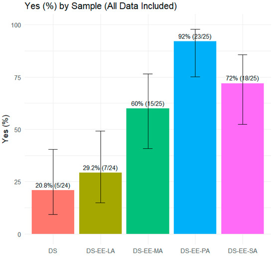 Proportion of participants willing to take each sample again (Yes/No). Data are presented as percentage of ‘Yes’ responses with Wilson 95% confidence intervals (n = 25). Samples tested were diclofenac sodium (DS) and DS–Eudragit EPO–fatty acid (DS–EE–FA) complexes with lauric acid (DS–EE–LA), myristic acid (DS–EE–MA), palmitic acid (DS–EE–PA), and stearic acid (DS–EE–SA).