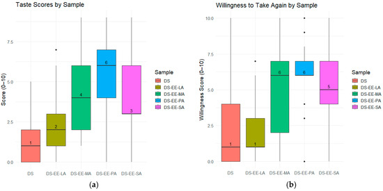 Participant evaluations of taste and willingness to take again across formulations. (a) Taste scores (0–10 scale; 0 = dislike very much, 10 = like very much); (b) Willingness-to-take-again scores (0–10 scale; 0 = extremely unlikely, 10 = extremely likely). Samples include diclofenac sodium (DS) and DS–Eudragit EPO–fatty acid (DS–EE–FA) complexes prepared with lauric acid (DS–EE–LA), myristic acid (DS–EE–MA), palmitic acid (DS–EE–PA), and stearic acid (DS–EE–SA). The horizontal line in each box represents the median score, which is also displayed as a numeric label, the box itself indicates the interquartile range (IQR, 25th to 75th percentiles), and the whiskers extend to show the rest of the distribution. Scores were provided by 25 participants for each sample.