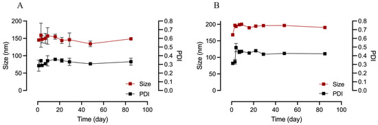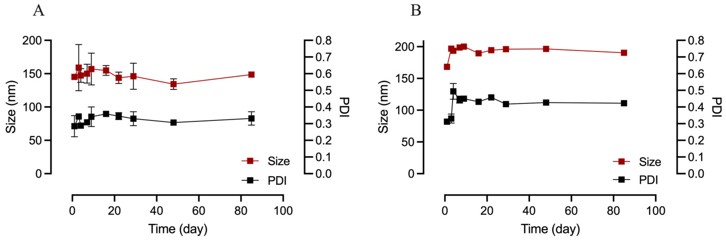 | PEA/Ste-PLGA-np | 128 ± 8 | 0.238 ± 0.010 | −33.9 ± 0.4 | 31.3 ± 1.6 |