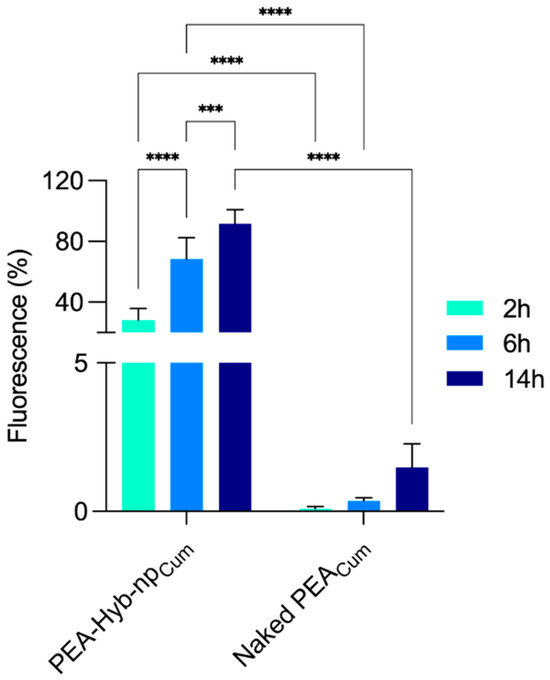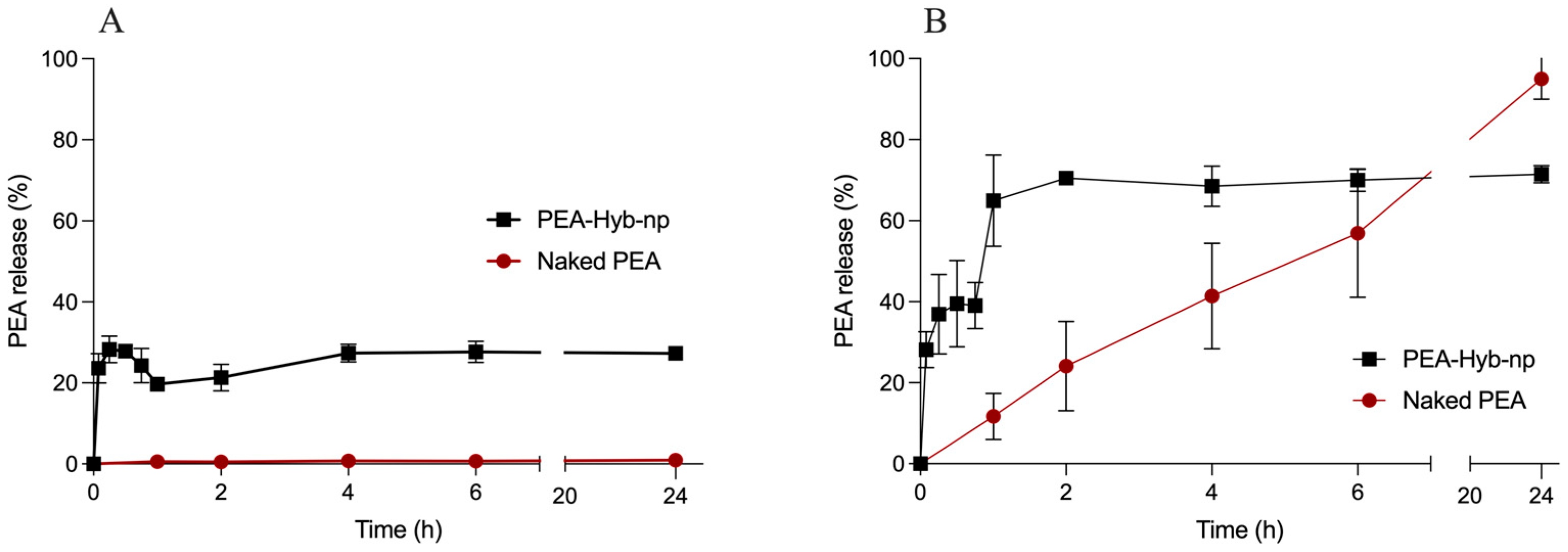 3.2.3. In Vitro PEA Release from Hybrid Nanoparticles