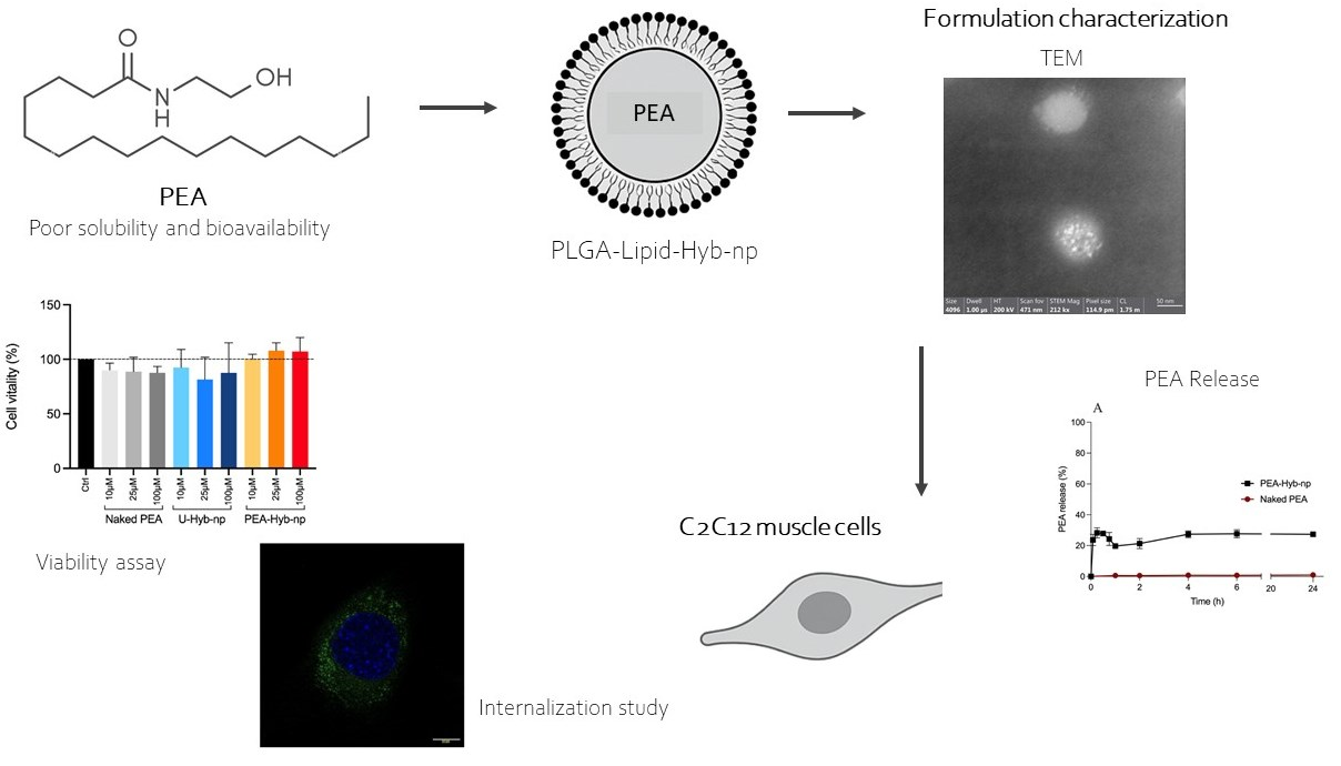 Maretti E, Molinari S, Partel S, Recchia B, Rustichelli C, Leo E. Investigating Hybrid PLGA-Lipid Nanoparticles as an Innovative Delivery Tool for Palmitoylethanolamide to Muscle Cells. Pharmaceutics. 2025; 17(11):1412. https://doi.org/10.3390/pharmaceutics17111412