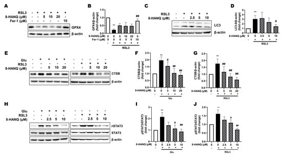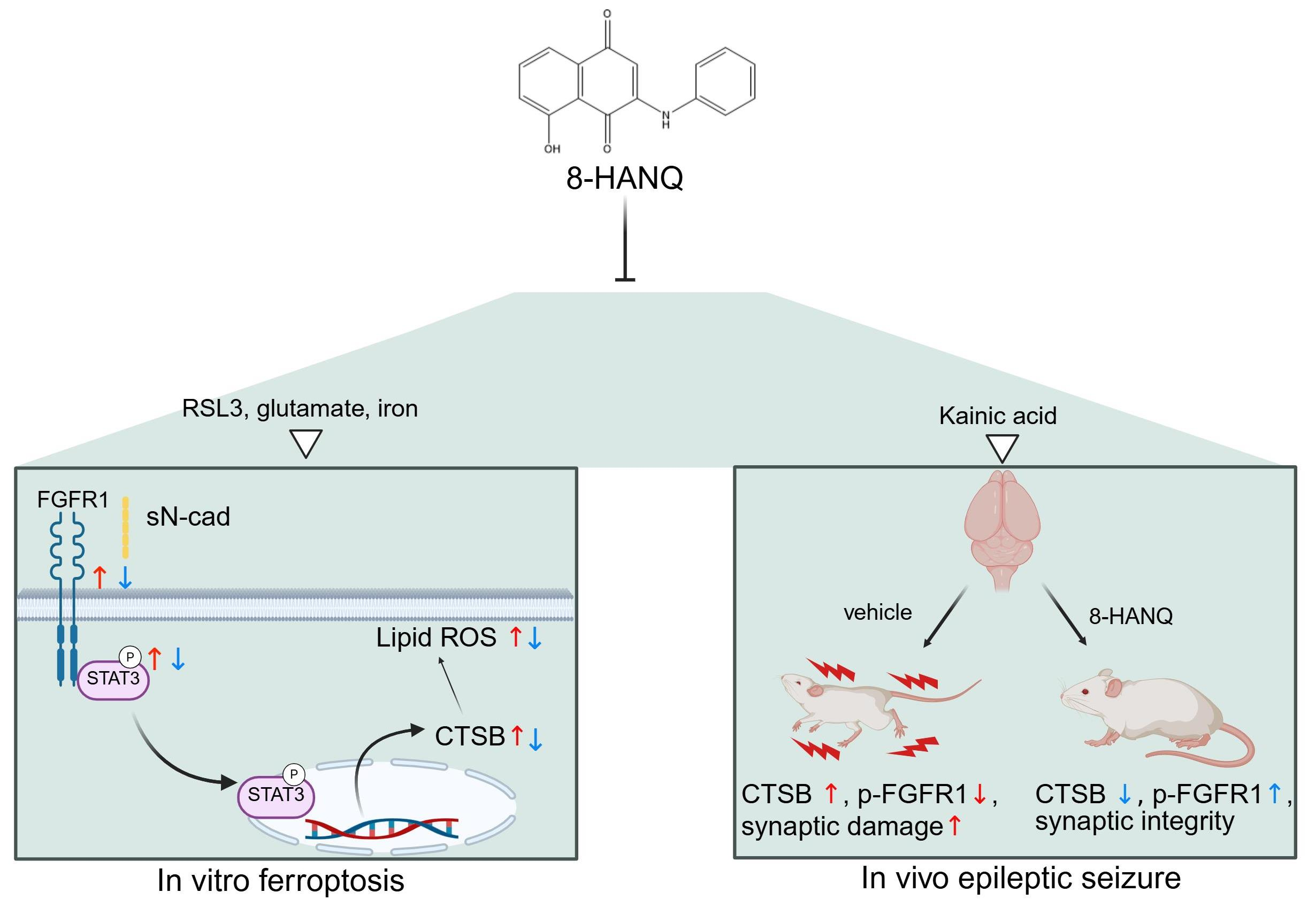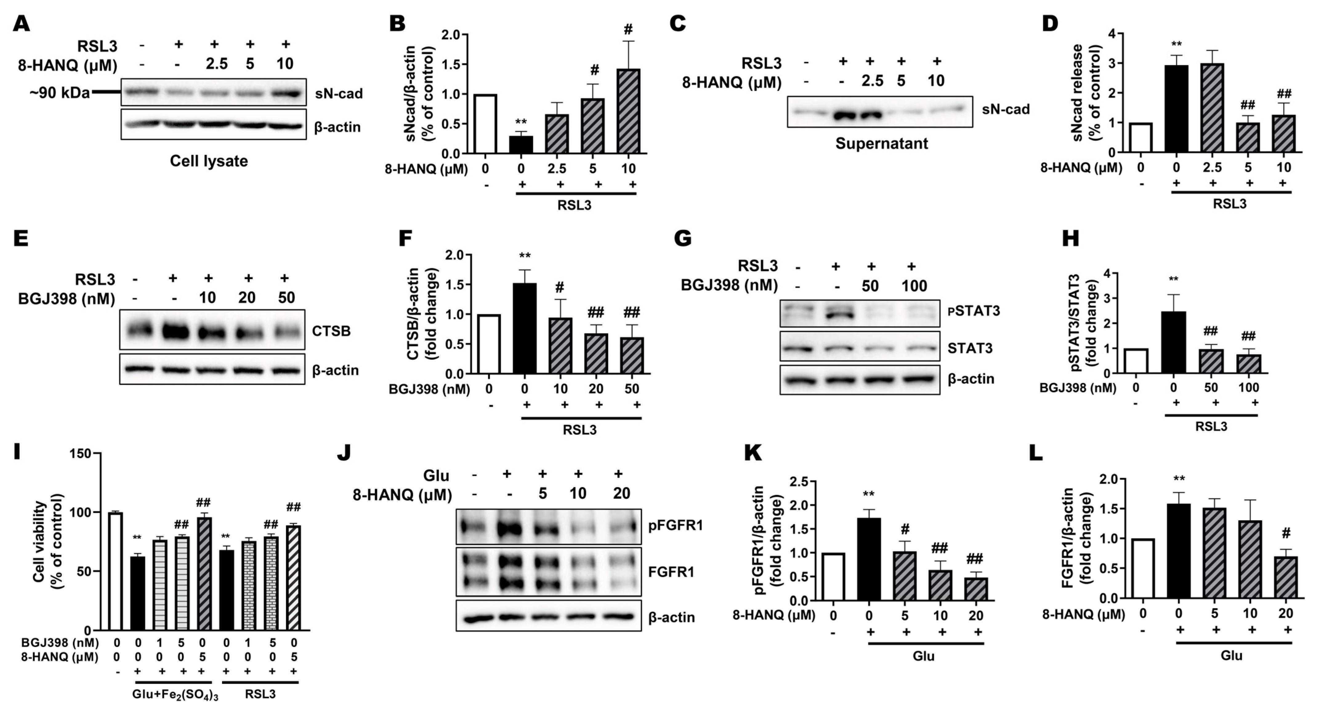 3.4. 8-HANQ Inhibits the STAT3/Cathepsin-B Axis Mediated by Soluble N-Cadherin/FGFR1 Signaling to Attenuate Ferroptosis