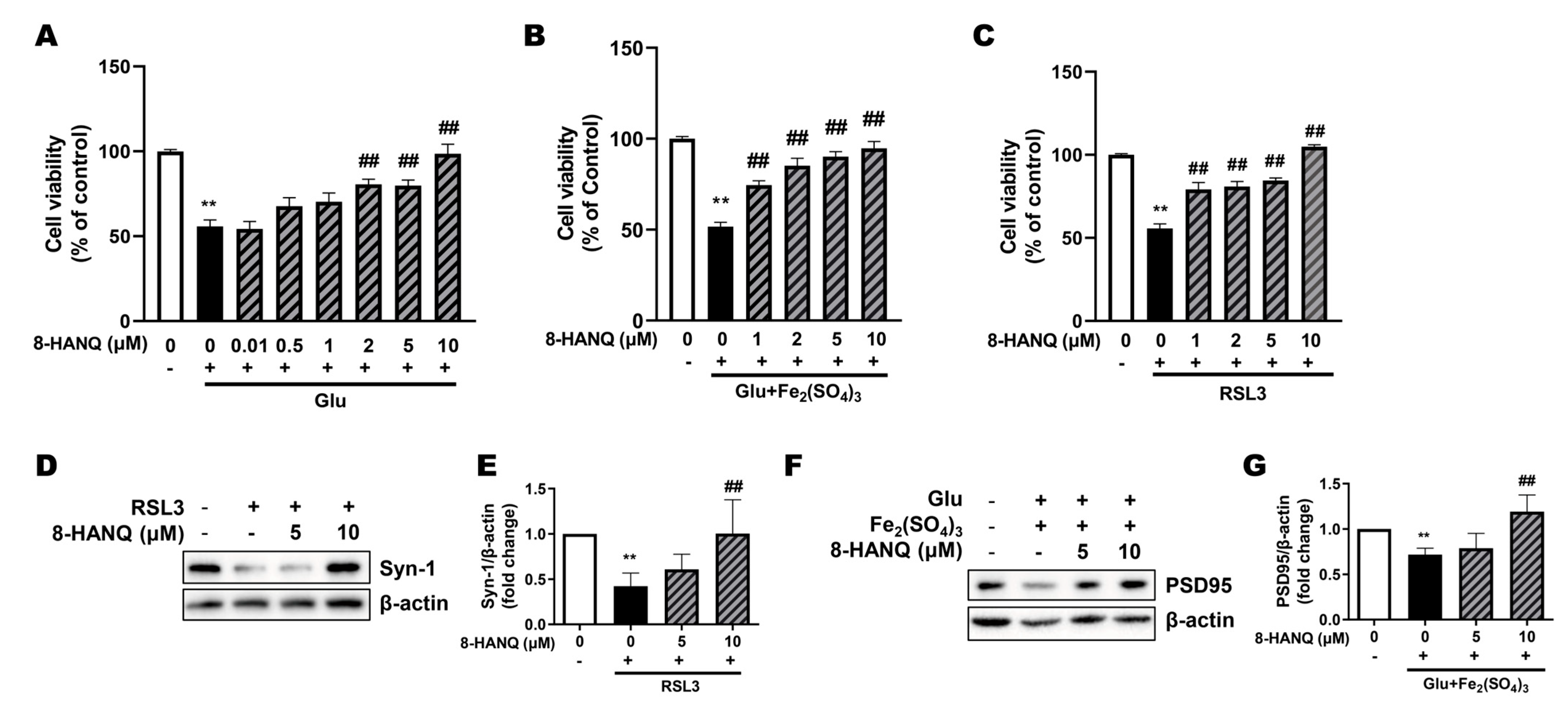 3.2. 8-HANQ Exhibits Dose-Dependent Neuroprotection Against Ferroptotic Neuronal Death and Synaptic Dysregulation in HT22 Cells