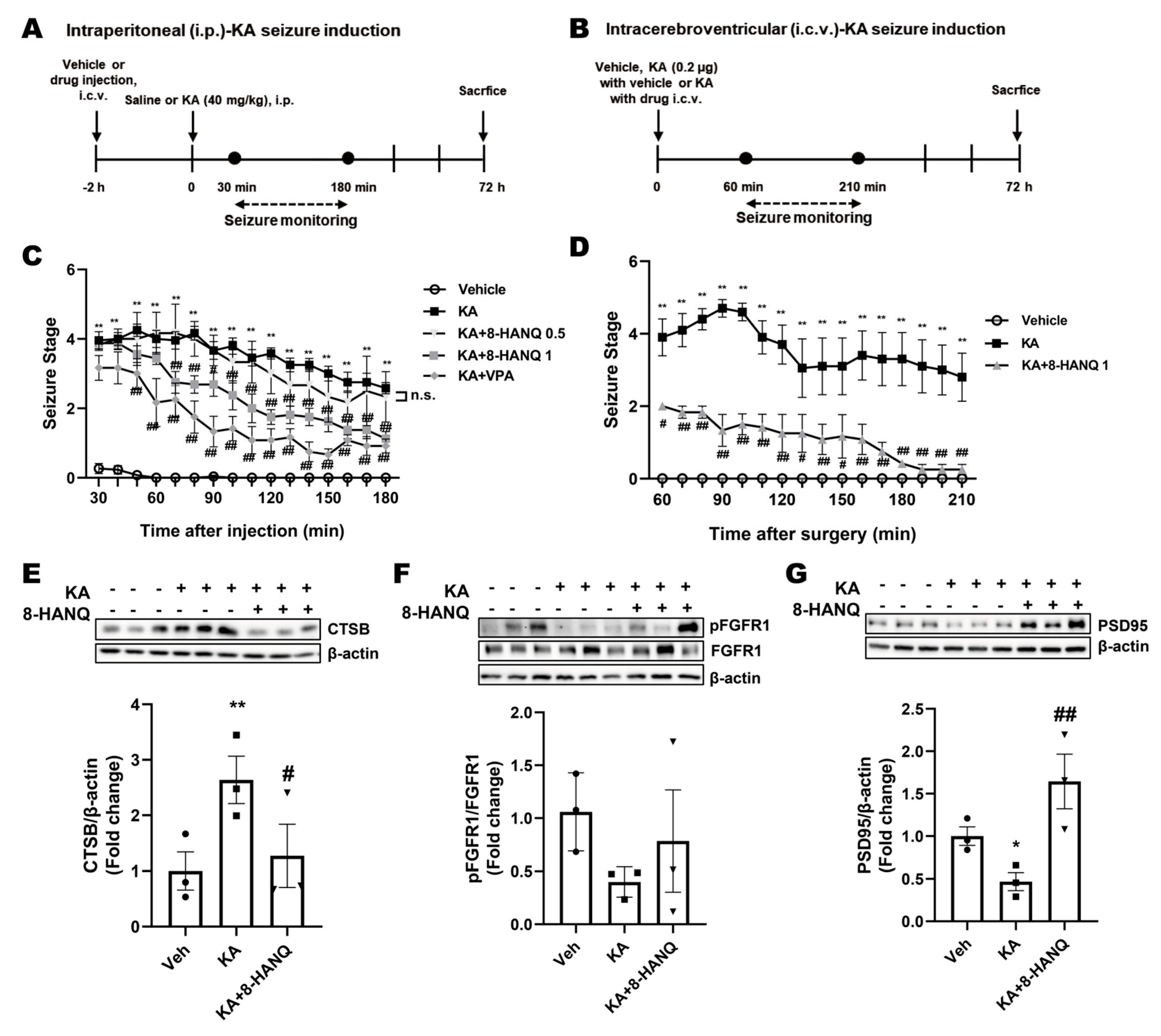 3.5. 8-HANQ Mitigates Seizure Severity and Restores Hippocampal Cathepsin-B, FGFR1, and PSD95 Dysregulation in KA-Induced Epileptic Mice