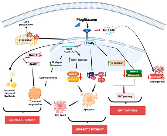 Schematic representation of pioglitazone’s mechanisms of action. Pioglitazone targets multiple cellular properties such as lipid peroxidation, aldehyde formation, and chemokines and signaling cascades, leading to alterations in the metabolic pathway, inhibition of EMT and angiogenesis, and induction of apoptosis. The sign green arrow denotes downregulation, red arrow denotes upregulation or increased expression, and ┴ denotes inhibition.