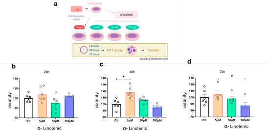 Experiments were performed using human keratinocytes (HaCaT) and human fibroblasts (BJ-5ta), purchased from the Rio de Janeiro Cell Bank, RJ, B (BCRJ/ https://bcrj.org.br). The cells were incubated at 37 °C in a 5% CO2 atmosphere for expansion in specific culture media [HaCaT: Dulbecco’s Modified Eagle’s Medium (DMEM) (Thermo Fisher Scientific, Waltham, MA, USA) with 4 mM L-glutamine, 4.5 g/L glucose, and 1.5 g/L sodium bicarbonate, supplemented with 10% Fetal Bovine Serum (FBS); BJ-5ta: 4 parts of DMEM with 4 mM L-glutamine, 4.5 g/L glucose, and 1.5 g/L sodium bicarbonate (Thermo Fisher Scientific, Waltham, MA,USA), combined with 1 part of Medium 199, supplemented with 0.01 mg/mL hygromycin B and 10% FBS(Sigma-Aldrich (Merck KGaA) St. Louis State, MO, USA]. After reaching 80–90% confluence, the cells were detached using a 0.25% trypsin solution and seeded into 12- or 24-well culture plates, according to the experimental groups in replicates. To verify cell viability by quantifying the number of living cells, the cytotoxicity of treatments was estimated, and cell proliferation was quantitatively detected by measuring the cell growth rate due to a linear relationship between cell activity and absorbance. The MTT (3-(4,5-dimethylthiazol-2-yl)-2,5-diphenyltetrazolium bromide) assay was performed(Thermo Fisher Scientific, Waltham, MA, USA) [15]. The cells were cultured in 12-well plates at a concentration of 5 × 105 cells/well until reaching 90–100% confluence and maintained in an incubator in an atmosphere of 5% CO2 at 37 °C for 24 h. To perform the assay, the culture medium was removed after washing with phosphate-buffered saline (PBS 0.1 M). α-Linolenic fatty acid (Cargill, Inc.,Wayzata, MN, USA)was added to the wells at concentrations of 5 µM, 50 µM, or 100 µM in culture medium and incubated for 24, 48, or 72 h. Absolute ethanol (ETOH) P.A. (dilution solution for ALA) was used as the control at the highest concentration. Afterward, the treatment medium was removed, the wells were washed with phosphate-buffered saline (PBS 0.1 M), and the cells were incubated for two hours with MTT solution (5 mg/mL). They were then subjected to a 15-min reaction with dimethyl sulfoxide (DMSO) under light protection and gentle agitation. The absorbance was read with a spectrophotometer (brand and model) at wavelengths of 550 and 620 nm using a microplate reader (Globomax, Promega Corporation, Maadison, WI, USA).