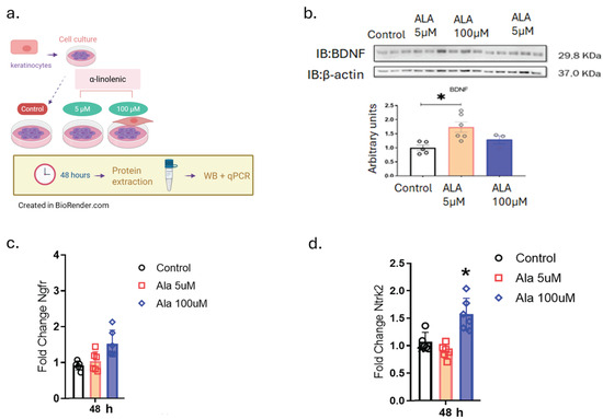 The next step was to evaluate the effect of ALA on the modulation of neurotrophins and their receptors (Figure 2). The choice for keratinocytes was based on a prior study that described the expression of neurotrophins by this type of cell [12]. The results show that at a concentration of 5 µM ALA there is positive modulation of BDNF protein expression and at 100 µM there is an increase in the gene expression of tropomyosin receptor kinase B (Ntrk2), but not of Ngfr in keratinocytes (Figure 2b–d).
