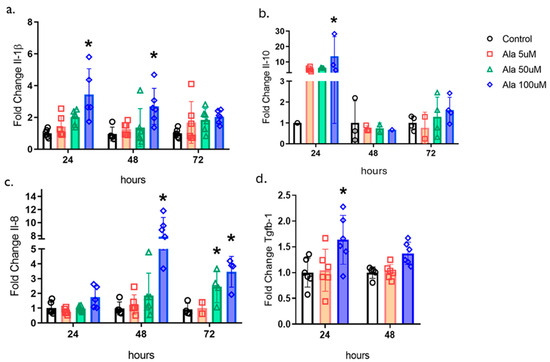 To understand the effects of ALA on the molecular modulation of the healing process, we examined the gene expression of cytokines and growth factors in human keratinocytes (Figure 3). We found that ALA resulted in an increase in the gene expression of pro-inflammatory cytokines such as Il-1β and Il-8, as well as an increase in the anti-inflammatory cytokine IL-10, in addition to an increase in Tgf-β1 at a concentration of 100 µM (Figure 3a–d).