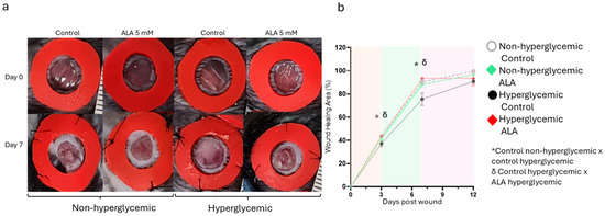 Effects of ALA on Wound Healing Modulation in Non-Hyperglycemic and Hyperglycemic Mice: (a) Macroscopic evaluation of wounds on days 0 and 7, comparing treatment with 5 mM ALA versus control (vehicle) in both hyperglycemic and non-hyperglycemic mice; (b) Imaging measurements illustrating the progression of healing from day 0 to day 12. The images are representative of five independent experiments, with a total sample size of n = 5 per group. Statistical significance was determined at * δ p < 0.05 using one-way ANOVA, comparing ALA treatment to the vehicle, highlighting the efficacy of ALA in promoting wound healing in both conditions.