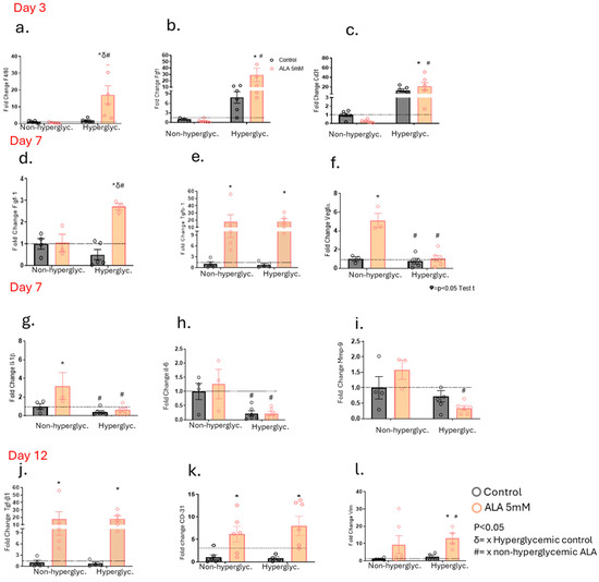 After identifying the synergistic modulatory effects of ALA on other fatty acids with important functions in wound healing, we investigated the modulation of gene expression of glycoproteins, enzymes, cytokines, chemokines, and growth factors in the wounds of non-hyperglycemic and hyperglycemic animals. On day 3 post-wounding, we observed an increase in F4/80 gene expression in mice treated with ALA compared to their controls in the hyperglycemic group (Figure 5a). Additionally, there was an increase in Fgf-1 gene expression in the hyperglycemic group, regardless of ALA treatment (Figure 5b). CD-31, a marker for endothelial cells, was elevated in hyperglycemic mice, whether treated with ALA or not (Figure 5c). Furthermore, on day 7 post-wounding, Fgf-1 gene expression increased in hyperglycemic mice treated with ALA; this increase was not observed in hyperglycemic controls or in the non-hyperglycemic group (Figure 5d). Tgf-β1 gene expression was elevated in both non-hyperglycemic and hyperglycemic mice treated with ALA compared to their respective controls (Figure 5e). Similarly, Vegf expression increased only in the non-hyperglycemic group treated with ALA, relative to its control and the hyperglycemic mice (Figure 5f). Il-1β levels were higher in the non-hyperglycemic control group and in the ALA-treated group compared to the hyperglycemic group, regardless of whether they were treated with ALA or not (Figure 5g). Likewise, IL-6 levels decreased in both hyperglycemic groups—treated or not with ALA—when compared to the non-hyperglycemic group (Figure 5h). Similarly, Mmp-9 expression was reduced in hyperglycemic mice treated with ALA (Figure 5i). On day 12 post-wounding, Tgf-β1 gene expression was once again elevated in both non-hyperglycemic and hyperglycemic animals treated with ALA compared to their respective controls (Figure 5j). Additionally, CD-31 expression was increased in both groups of animals treated with ALA (Figure 5k). Vimentin levels were elevated in animals treated with ALA (Figure 5l).