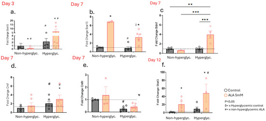 Next, we investigated whether, as in the cells, wounds treated with ALA would also undergo changes in the expression of genes involved in peripheral nerve regeneration. We observed an increase in Sox-10 gene expression on day 3 in the hyperglycemic group, regardless of whether they were treated with ALA or not (Figure 6a). On day 7, there was an increase in Sox-10 expression in both non-hyperglycemic and hyperglycemic groups treated with ALA (Figure 6b). Furthermore, on day 7, we observed an increase in Bdnf gene expression in the ALA-treated hyperglycemic group (Figure 6c), along with an increase in Cntf expression in both non-hyperglycemic and hyperglycemic animals treated with ALA (Figure 6d). Additionally, Cntf receptor expression was decreased in hyperglycemic mice, independent of treatment (Figure 6e). Moreover, on day 12, we observed an increase in Stat-3 gene expression in both groups treated with ALA compared to their respective controls (Figure 6f).
