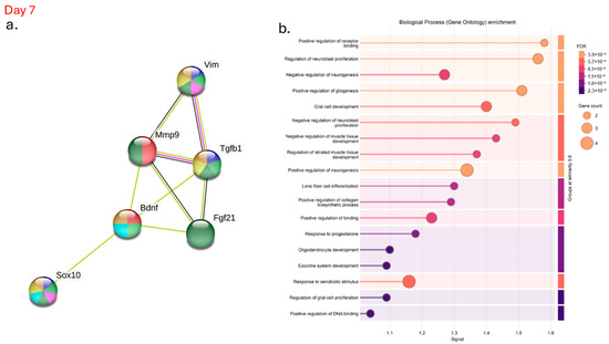 After evaluating the genes involved in the survival and growth of neurons, we investigated the protein–protein interaction network (Figure 7), which indicates known and predicted interactions involving increased gene expression, including those from curated databases, gene co-expression, and protein homology. There was an association of effects and co-expression between vimentin, Mmp-9, FG21, TGF-β1, SOX-10 and BDNF on day 7 in the hyperglycemic mice (Figure 7a, green and black lines). In addition, there are interactions between vimentin, TGF-β1, and MMP-9, which were identified in the interactome; the pink line indicates that the data were confirmed through experimental research (Figure 7a, pink lines). Gene Ontology enrichment highlights the biological processes associated with BDNF regulation during wound healing. The genes studied in this interactome are significantly involved in the regulation of neuroblast proliferation, as well as in the positive regulation of gliogenesis and neurogenesis on day 7 in hyperglycemic animals treated with ALA (Figure 7b).