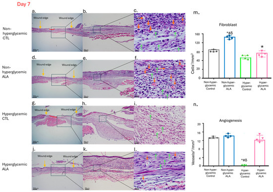 Effects of ALA on the Modulation of Newly Formed Skin Tissue 7 Days After Wounding: (a–c) Images of wounds from non-hyperglycemic animals treated with vehicle (Control), exhibiting expected tissue regeneration characterized by inflammatory infiltrate and granulation tissue formation, including visible fibroblasts and blood vessels; (d–f) wounds from non-hyperglycemic animals treated with ALA, displaying a similar pattern of tissue regeneration as observed in vehicle-treated non-hyperglycemic animals; (g–i) wounds from hyperglycemic animals treated with vehicle, demonstrating delayed healing, with wounds remaining in the inflammatory phase; (j–l) wounds from hyperglycemic animals treated with ALA, showing enhanced healing characteristics, with wound appearance nearly comparable to that of non-hyperglycemic animals; (m) fibroblast count; (n) blood vessel count per1/4 ¼ mm2 of tissue across different groups, showing a significant increase in fibroblasts in both non-hyperglycemic and hyperglycemic groups treated with ALA and once again, a delay in the healing process, with the maintenance of the inflammatory process. Yellow arrows indicate the wound edge, orange arrows denote blood vessels, green arrows highlight fibroblasts, red braces illustrate areas of epidermal discontinuity, and the black square marks the region represented in the subsequent figure. Magnification is 500 µm in (a,d,g,j); 50 µm in (b,e,h,k); and 20 µm in (c,f,i,l). Data are representative of n = 4 for each group. Statistical significance was assessed using one-way ANOVA, comparing hyperglycemic control versus hyperglycemic ALA at 5 mM, # non-hyperglycemic control, δ non-hyperglycemic ALA with * p < 0.05.