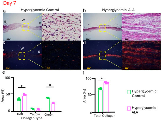 Representative picrosirius red staining was evaluated without polarized microscopy (a,b), and with polarized light (c,d), for hyperglycemic control and hyperglycemic ALA wounds on day 7, respectively. Hyperglycemic ALA wounds show collagen fibers that are more organized and thicker than those of hyperglycemic control wounds. In (e), it is observed that hyperglycemic ALA wounds present a significantly larger quantity of collagen type I (red) compared to the controls, while hyperglycemic control wounds show more collagen type III (green). In (f), it is demonstrated that hyperglycemic ALA wounds exhibit a significantly larger quantity of total collagen when compared with the controls. Data are presented as mean ± SEM (n = 3 per group). Representative histology is shown in bright fields and polarized light microscopy, with scale bars of 500 μm and 20 μm. Statistical analysis was performed using one-way ANOVA followed by Tukey’s post-hoc test, comparing hyperglycemic control versus hyperglycemic ALA at 5 mM with * p < 0.05.
