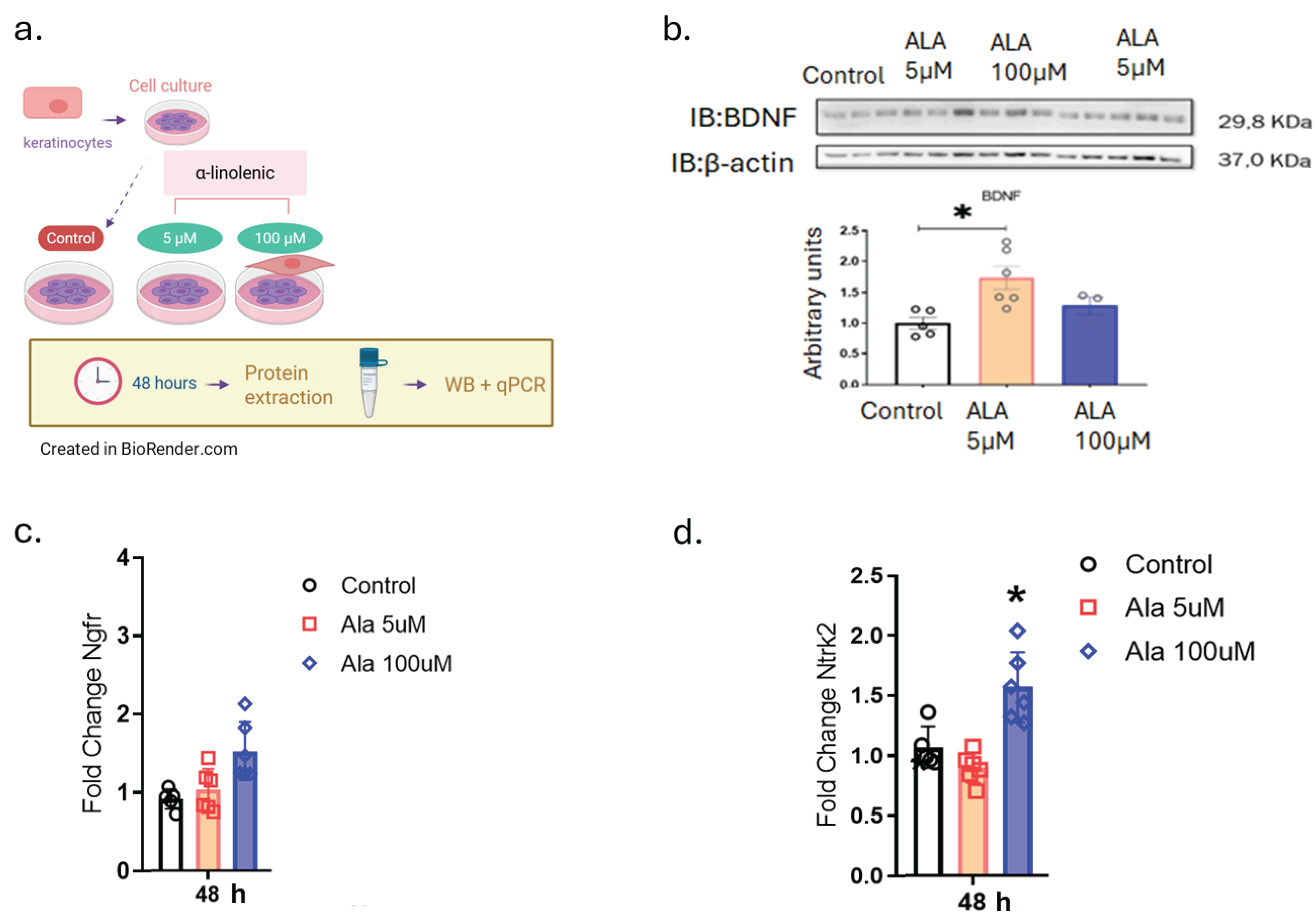 3.2. α-Linolenic Acid (ALA) Leads to Increased Protein Expression of BDNF and Gene Expression of This Receptor in Keratinocytes