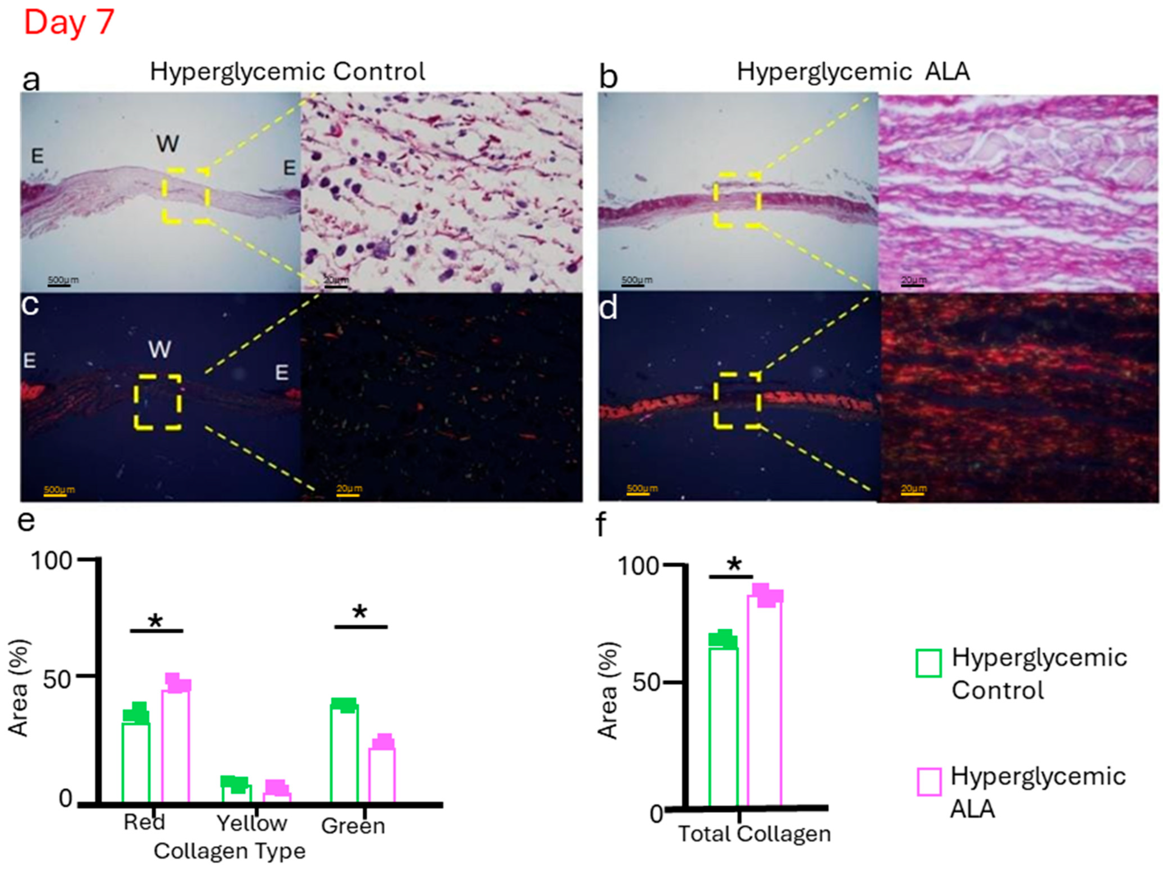 3.9. α-Linolenic Acid (ALA) Enhances Type I Collagen Deposition in Hyperglycemic Wounds During Critical Phases of Wound Healing