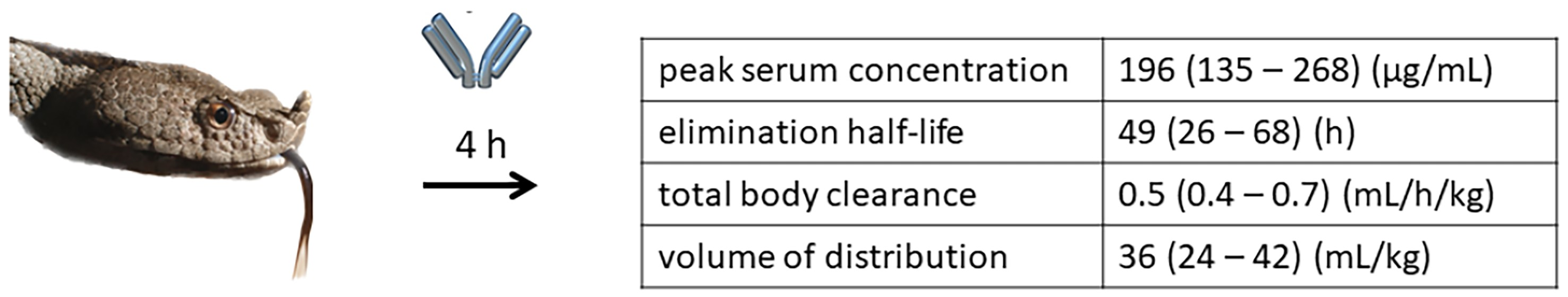 - Gamulin, E.; Mateljak Lukačević, S.; Lang Balija, M.; Smajlović, A.; Vnuk, D.; Gulan Harcet, J.; Tomičić, M.; Hećimović, A.; Halassy, B.; Kurtović, T. Pharmacokinetics of snake antivenom following intravenous and intramuscular administration in envenomed large animal model. Pharmaceutics 2025, 17, 212. [Google Scholar] [CrossRef] [PubMed]