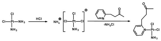 Ammonium trichloroammineplatinate(II) (90 mg, 0.28 mmol) was dissolved in 2 mL of 20% aqueous NaCl solution. Subsequently, 2-(3-oxobutyl)pyridine (60 mg, 0.4 mmol) was added, and the reaction mixture was heated at 50 °C for 48 h. Upon cooling to room temperature, a yellow precipitate formed, which was collected by filtration, washed successively with water and methanol, and dried under vacuum. Yield: 45 mg (37%). MS (ESI): a molecular ion peak corresponding to [M+H]+ was detected at m/z = 432. 1H NMR (400 MHz, DMSO-d6): δ = 9.13–9.08 (m, 1 H, Ar–-CH=N-), 8.00–7.94 (m, 1 H, Ar), 7.56–7.52 (m, 1 H, Ar), 7.42–7.37 (m, 1 H, Ar), 4.49–4.08 (br s, 2 H, -NH2), 3.68–3.62 (m, 2 H, -CH2-CH2-C(=O)-), 2.96–2.85 (m, 2 H, -CH2-CH2-C(=O)-), 2.18 (s, 3 H, CH3-C(=O)-) ppm.