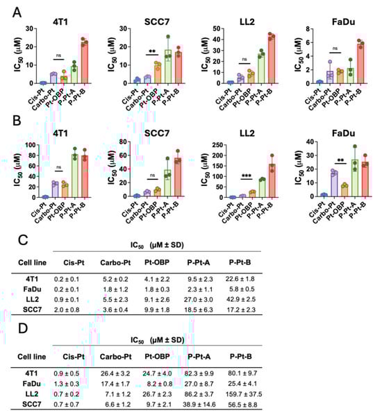 Pt-OBP shows higher or comparable cytostatic and cytotoxic activity in vitro to Carbo-Pt. Cytostatic (A) and cytotoxic (B) activities of Pt-OBP and its polymeric conjugates P-Pt-A and P-Pt-B determined using [3H]-thymidine incorporation and MTT assay, respectively, in 4T1, SCC7, LL2 and FaDu cell lines after 72 h of incubation. Cis-Pt and Carbo-Pt were used as reference substances. Results are shown as IC50 values with SD. Each experimental point represents IC50 value obtained in an independent experiment. Three independent experiments were performed. (C,D) Summary table of IC50 values ± SD. Statistical analysis was carried out using unpaired two-tailed Student’s t-test. Significant differences are shown (“ns” represents no significant difference; ** p ≤ 0.01, *** p ≤ 0.001).