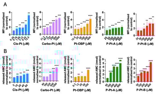 This observation is consistent with the known pharmacokinetics of platinum-based drugs, where Carbo-Pt requires longer incubation to reach peak activity due to slower hydrolysis into its active aqua complex compared to Cis-Pt [31]. The fact that Pt-OBP was markedly more effective than Carbo-Pt at 48 h, but showed comparable pro-apoptotic activity after 72 h, may suggest that the release of its active species occurs faster than in Carbo-Pt, but slower than in Cis-Pt. As a result, Pt-OBP may provide an advantage in inducing apoptosis in tumors especially at earlier time points post-administration.