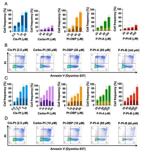 Pt-OBP and its polymeric conjugates potently induce apoptotic cell death in tumor cells in vitro. Percentage of apoptotic cells after 48 h (A) and 72 h (C) incubation with Pt-OBP, P-Pt-A and P-Pt-B obtained using Annexin V assay. Cis-Pt and Carbo-Pt were used as reference substances. Data show the distribution of the cells in different phases of the apoptotic cell death—from the bottom: PI− Annexin V+ (early apoptosis); PI+ Annexin V+ (late apoptosis); and PI+, Annexin V− (necrosis). Data are shown as a mean from three independent experiments ± SD. Representative dot plots are shown for each sample both after 48 h (B) and 72 h incubation (D).