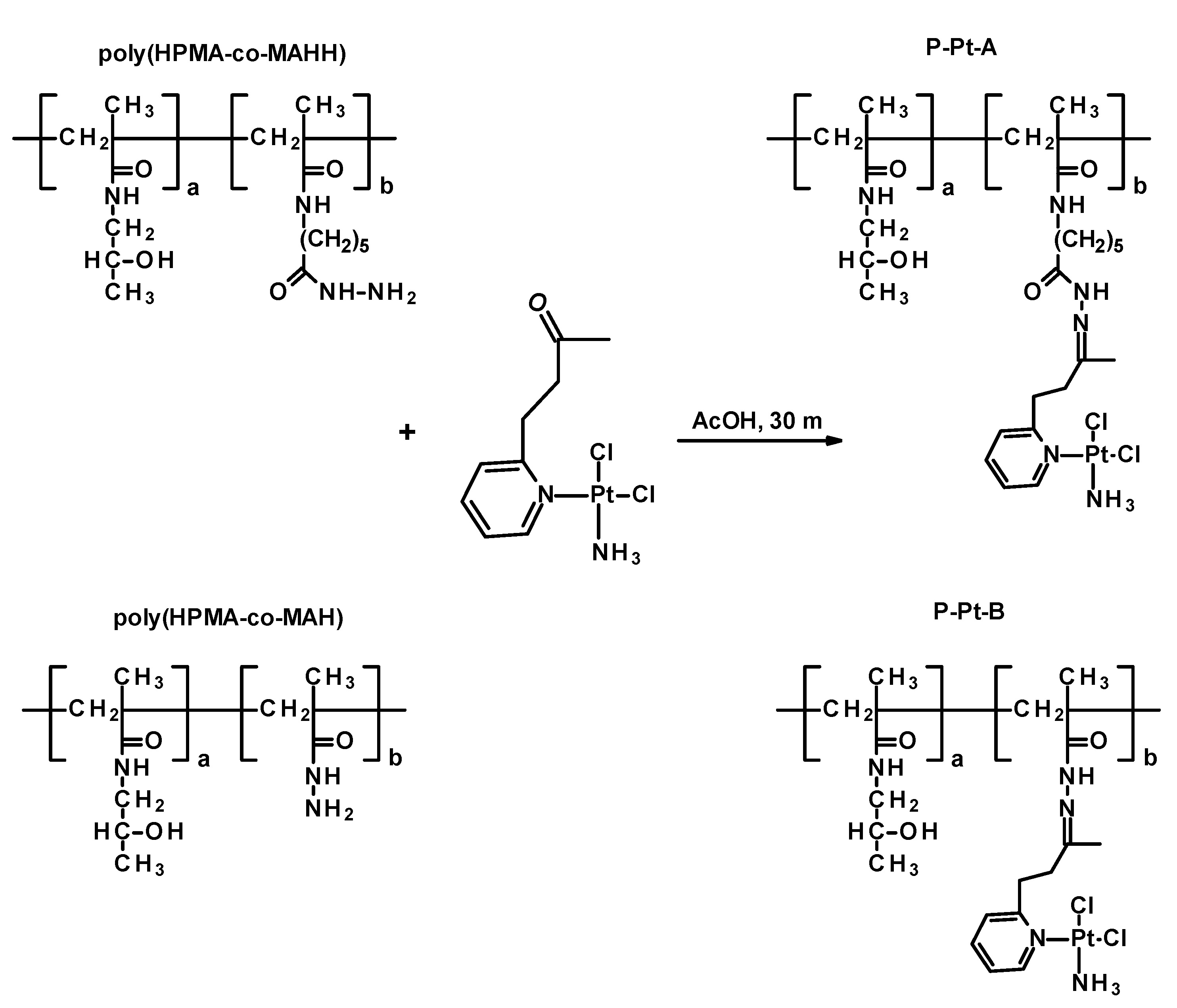 Pt-OBP (70 mg, 0.16 mmol) was dissolved in 1.0 mL of dimethylformamide and added to a solution of poly(HPMA-co-MAH) (400 mg, 0.11 mmol of hydrazide groups) in 2 mL of acetic acid. The reaction mixture was stirred at room temperature for 150 min. The resulting polymer conjugate was precipitated into 10 mL of a diethyl ether/dichloromethane mixture (1:1, v/v). The crude product was collected by centrifugation, reprecipitated twice from a methanol solution into the same ether/dichloromethane mixture, and dried under vacuum. Yield: 450 mg; Mw = 89,000 g mol−1; Mw/Mn = 1.95 (GPC); platinum complex content: 4.0 wt% (HPLC).
