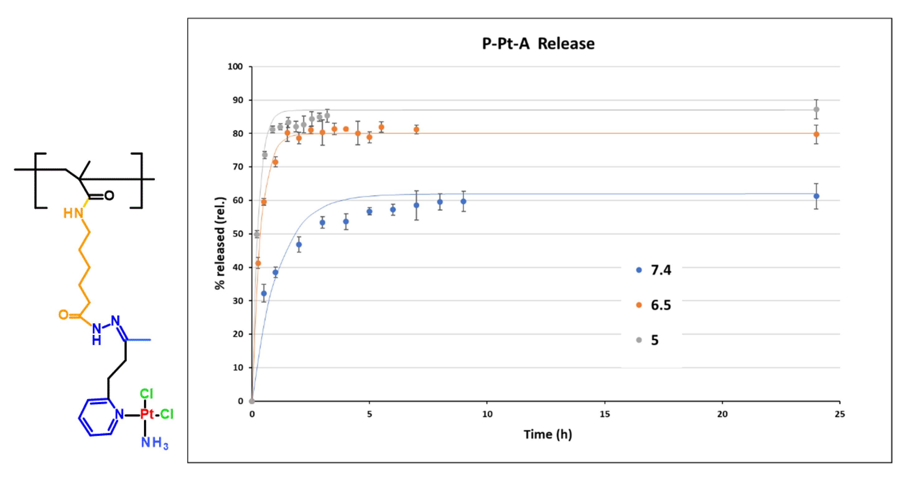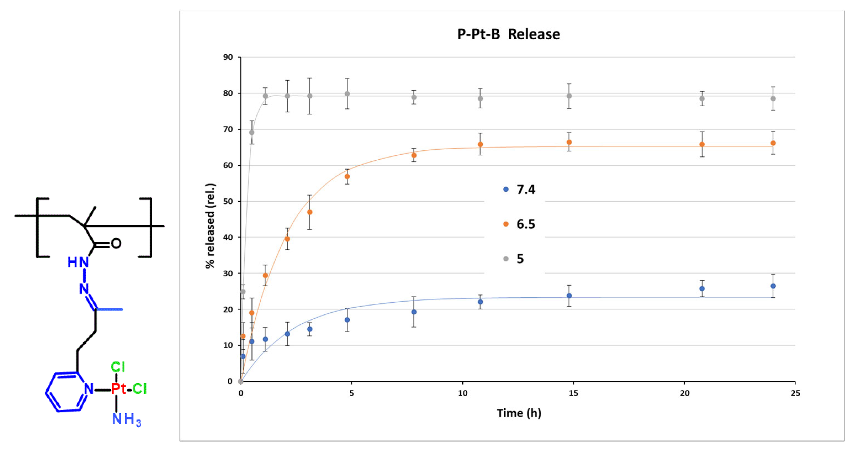 Platinum release from the polymer conjugates was studied in 1 mg/mL solutions incubated at 37 °C in three buffer systems: phosphate-buffered saline (PBS, pH 7.4), acetate–borate buffer (pH 6.5), and acetate buffer (pH 5.0). The amount of released platinum complex was quantified by HPLC and expressed as a percentage of the total drug content bound to the polymer at each time point.