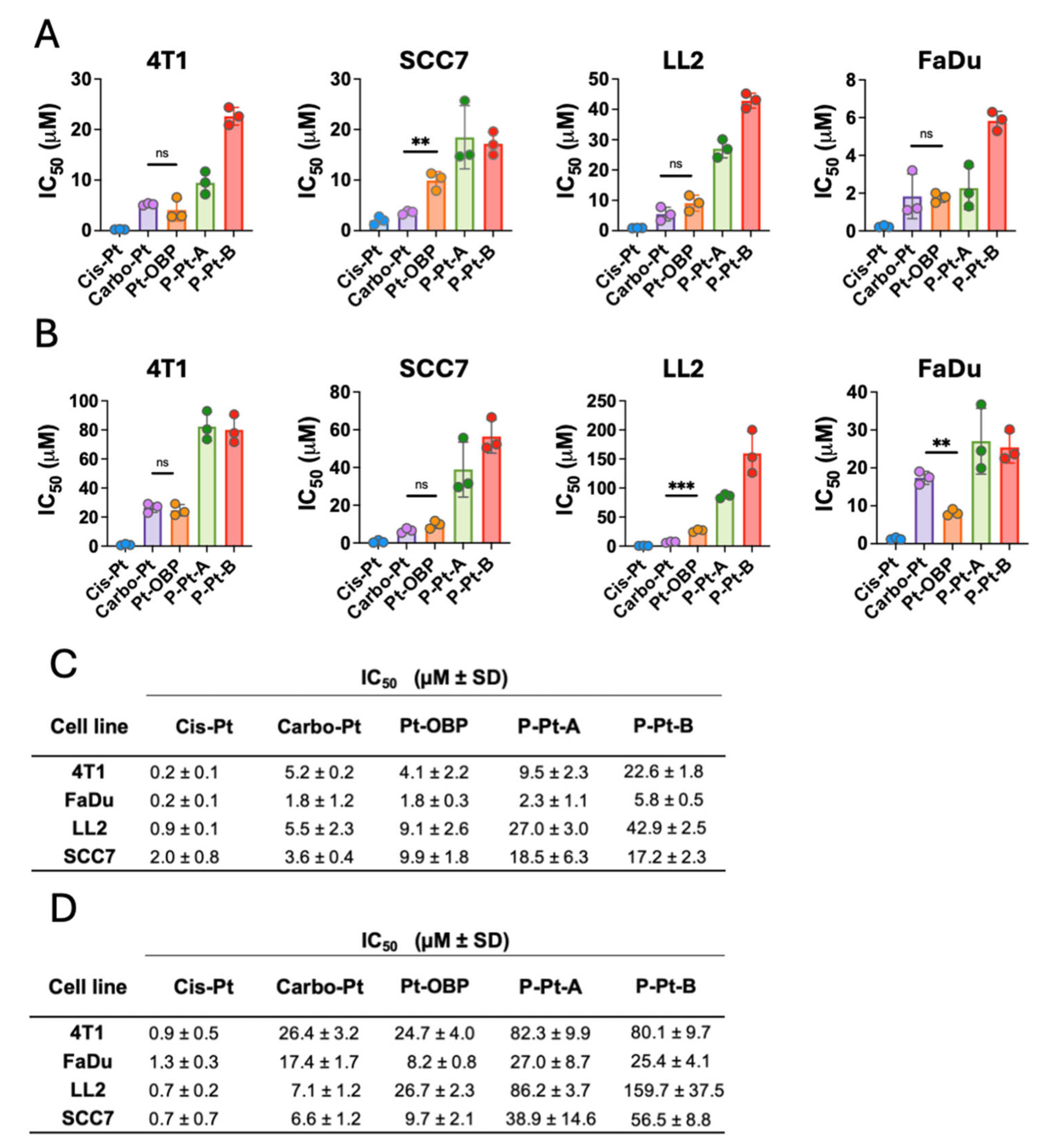 We showed that the novel platinum (II) derivative Pt-OBP exhibits potent anticancer activity in vitro, comparable to or exceeding that of the clinically used drug carboplatin. Pt-OBP effectively inhibited cell proliferation and induced cell death in several cancer cell lines, including murine 4T1, LL2, and SCC7, as well as the human head and neck cancer cell line FaDu. Notably, FaDu cells were highly sensitive to Pt-OBP, with cytostatic and cytotoxic IC50 values comparable to those of cisplatin and lower than those of carboplatin.