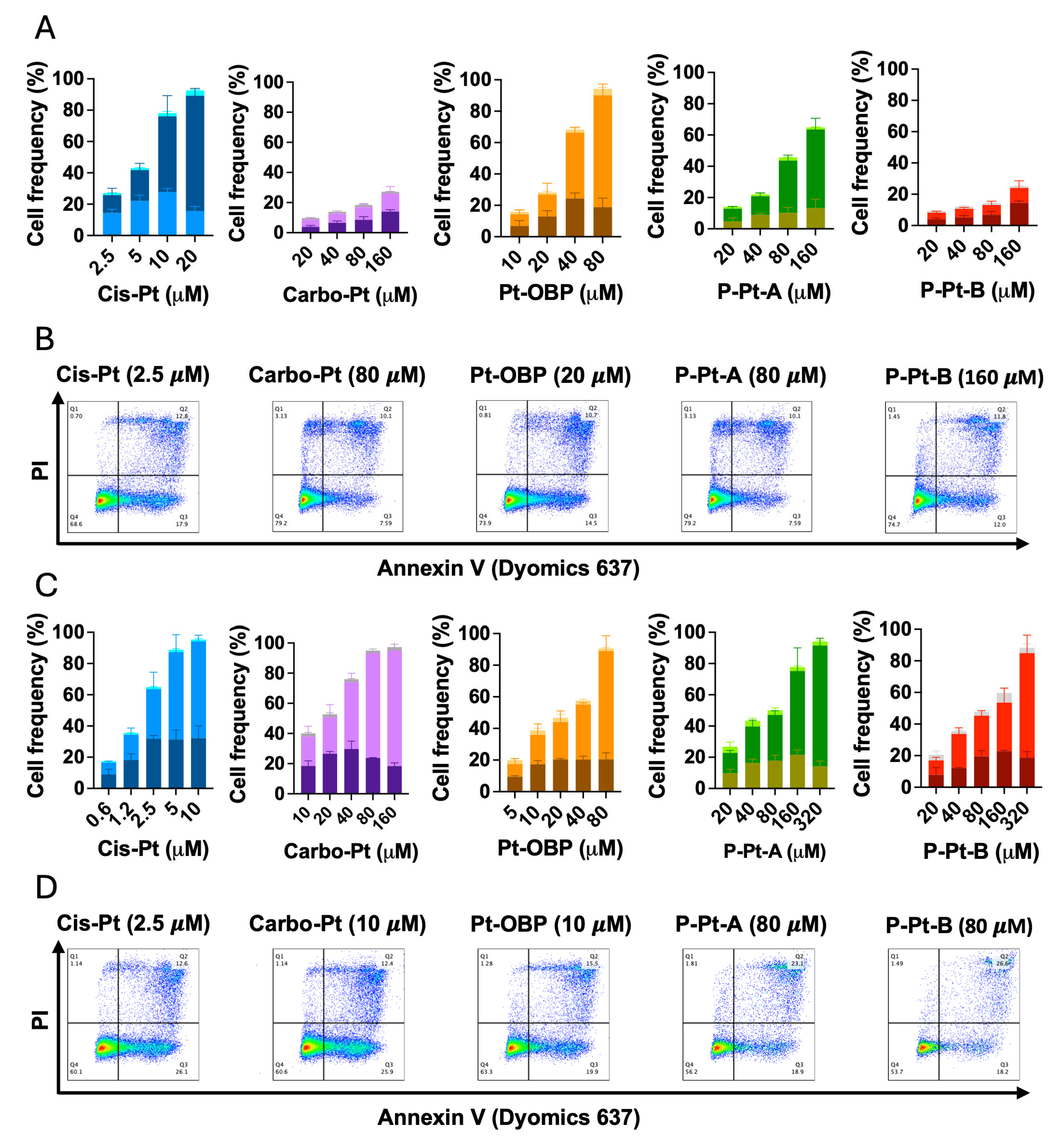Importantly, the biological activity of Pt-OBP was preserved after conjugation to HPMA copolymers, with both P–Pt–A and P–Pt–B conjugates showing pH-responsive drug release but with P-Pt-B being more stable at blood pH. These findings align with the known advantages of polymer–drug conjugates, including controlled release, prolonged circulation, and the potential for tumor-selective accumulation via the enhanced permeability and retention (EPR) effect. Collectively, these results validate Pt-OBP as a potent anticancer agent with a mechanism of action similar to established platinum-based drugs and demonstrate that its polymer conjugates preserve therapeutic activity while offering tunable release kinetics.