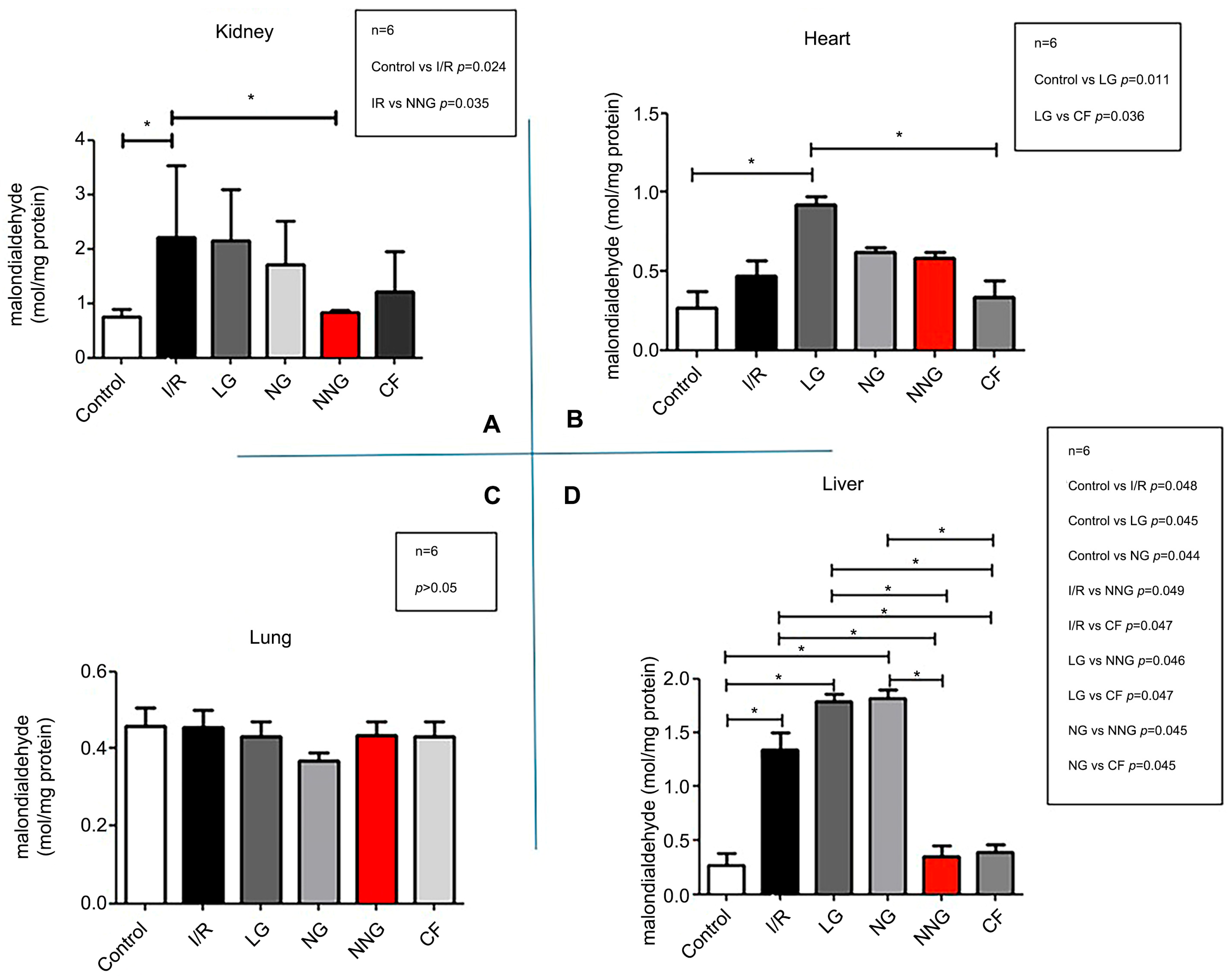 Figure 2 demonstrates oxidative damage in different organs (A: kidney, B: heart, C: lung, D: liver).