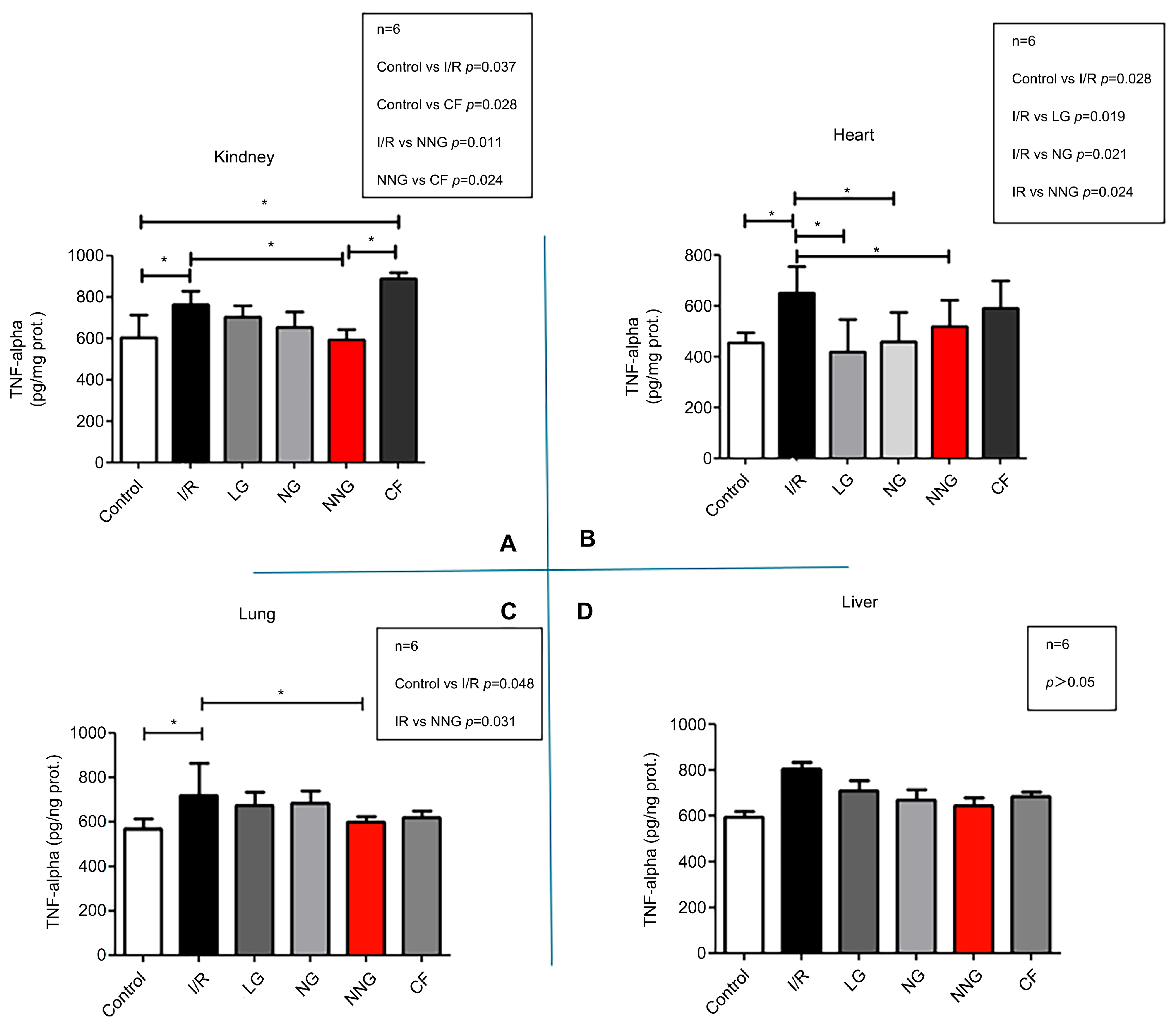 17]. In our study, the evaluation of TNF-alpha levels measured in kidney, liver, lung, and heart tissues revealed that inflammation was suppressed in all organs by all methods. Contrary to the MDA results, TNF levels were most effectively suppressed in the liposome group in heart tissue. This discrepancy arises from the different pathways involved in inflammation and oxidative stress processes. As Forman and Zhang pointed out in their 2021 publication in Nature, oxidative stress does not always trigger inflammation, as inflammation is a cellular response that progresses through distinct pathways mediated by cytokines [