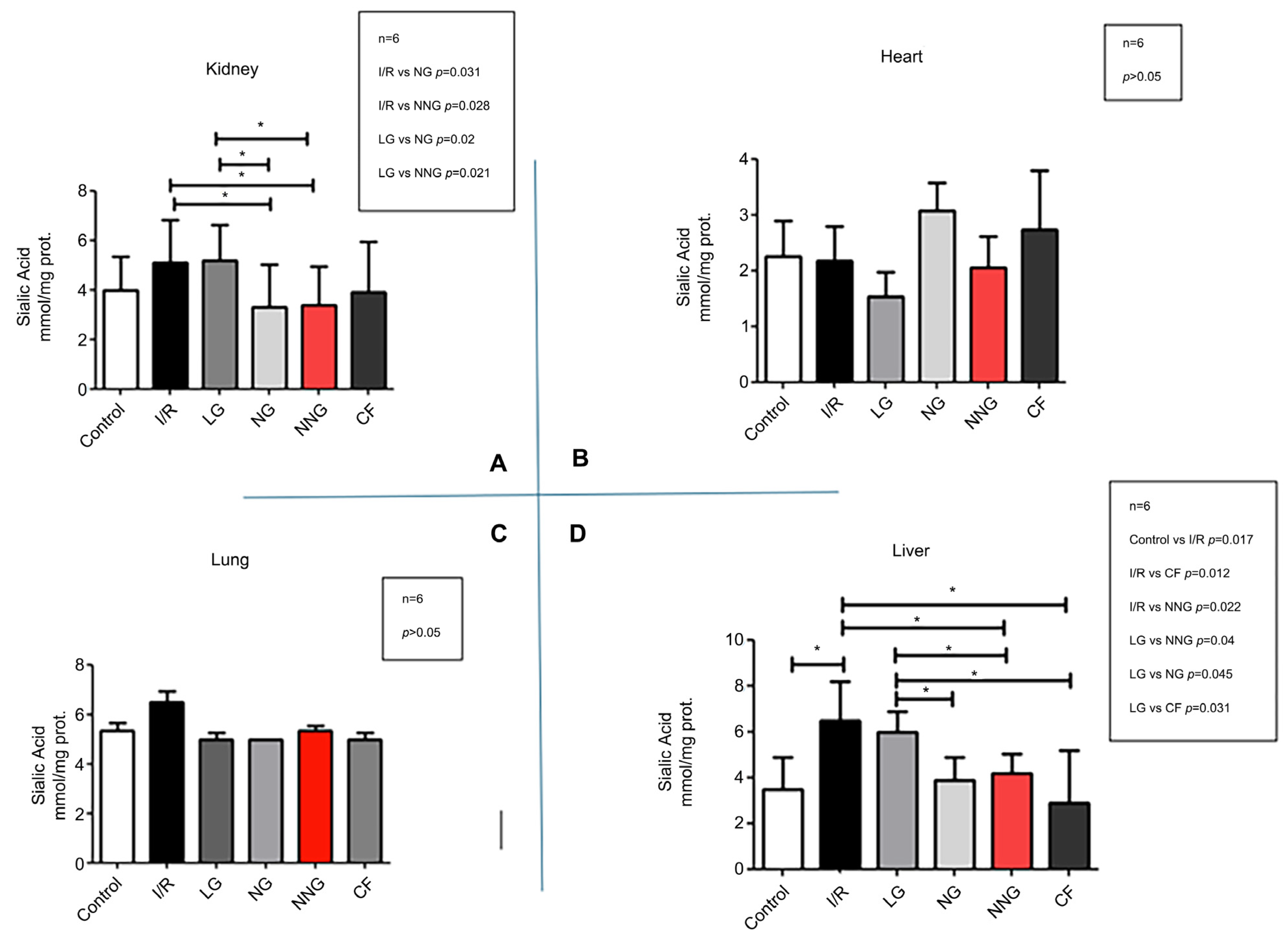 22]. In our study, similar to MDA levels, NN significantly prevented glycocalyx damage in the liver and kidneys, with the efficacy of the niosome being comparable to that of NN. However, liposome treatment was found to cause greater glycocalyx damage compared to the other groups. The absence of a corresponding difference in MDA levels for the liposome group is likely because sialic acid, as an early-stage marker, may be tolerated in the later stages. Moreover, we hypothesize that the early oxidative stress triggered by the liposome’s cholesterol content, potentially leading to rheological disturbances in capillaries, contributed to this effect. The study by Collin et al., published in 2020, supports this hypothesis regarding liposome effects [