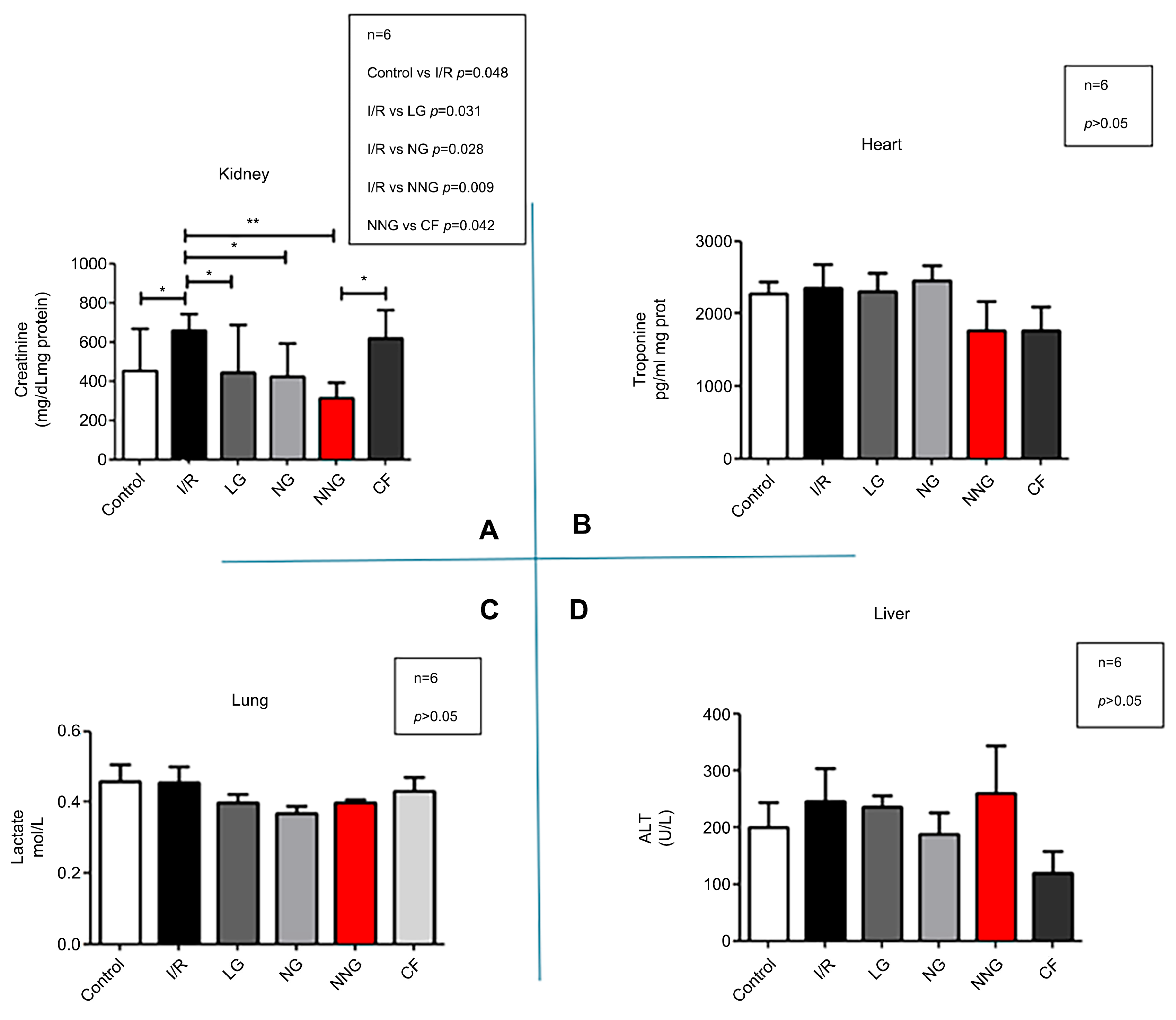 Lactate, creatinine, ALT, and troponin data sets were normally distributed and presented as mean ± SD. One-way ANOVA followed by Tukey’s test as a post hoc analysis was used for normally distributed sets.