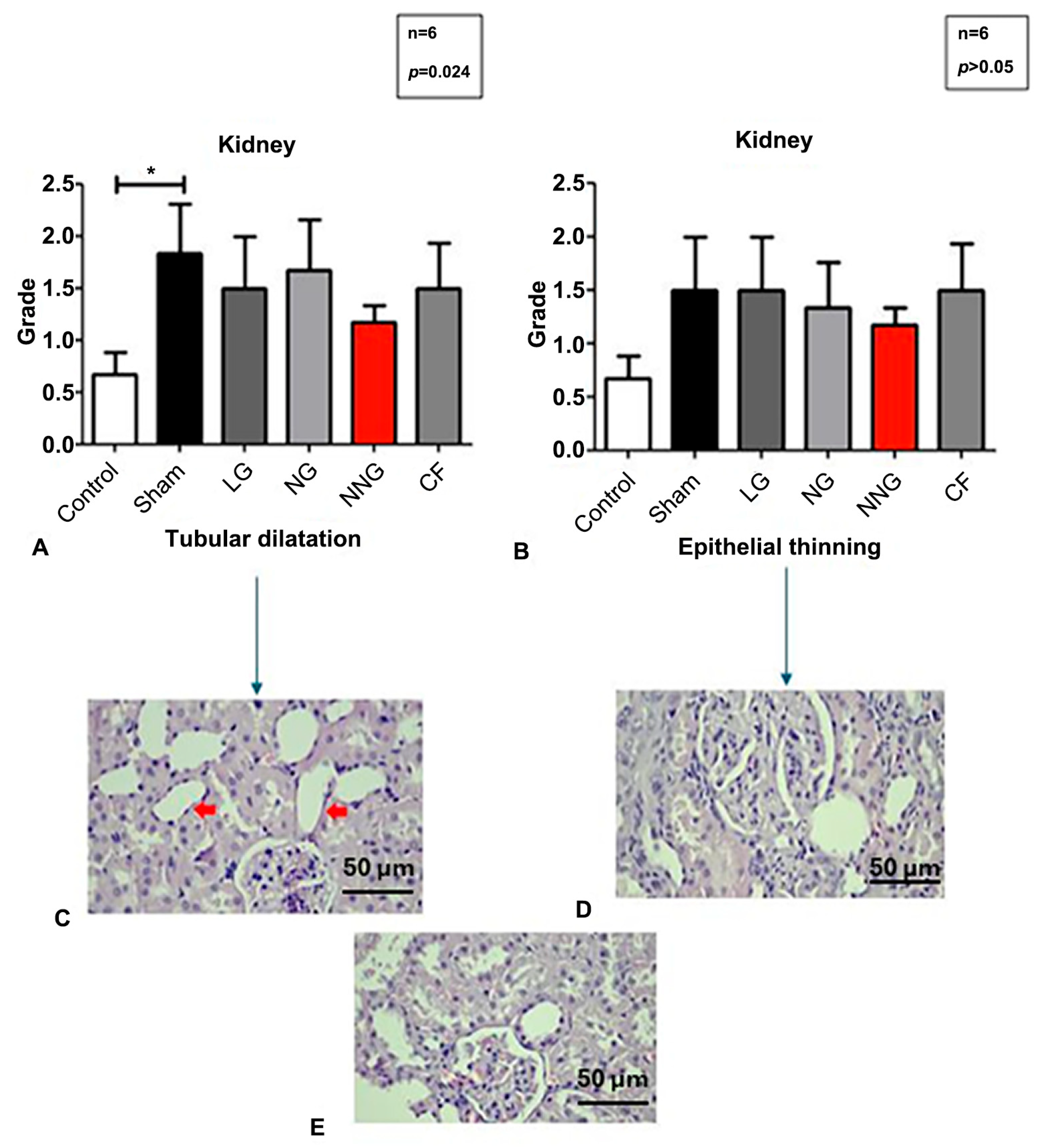 35]. Although NN treatment appeared to reduce tubular dilation and epithelial thinning compared to the I/R group, these differences were not statistically significant. Therefore, while a trend toward histological improvement was observed, these findings should be interpreted with caution.