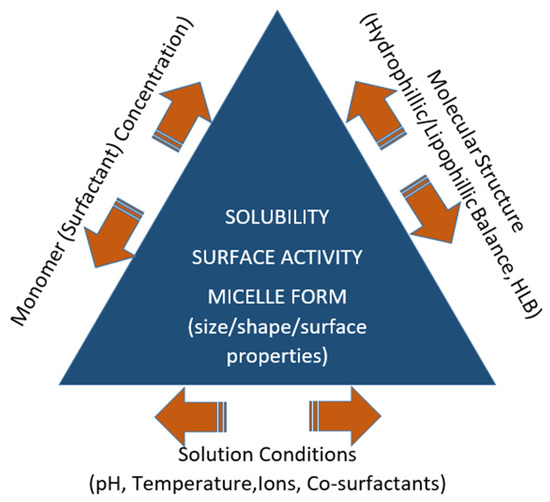 This equilibrium means that micellization is a reversible process. At concentrations lower than the CMC, the molecules of the surfactant are in the form of monomers and tend to accumulate at the air–water (or oil–water) interface. As the surfactant concentration is increased, both the bulk and the interface are saturated at a specific concentration, and the increased activity leads to self-aggregation (or self-assembly). However, for the polymeric micelles, the transition is not sharp and is highlighted by the gradual formation of dimers, trimers, etc. [32]. Hence, around the CMC, the micelles are loose and may contain some water in their core. They become more compact, durable, and smaller in size when the surfactant concentration is increased. Further increase in surfactant concentration may lead to changes in micellar morphology such as a transition from a spherical to cylindrical configuration. Micelle formation characteristics, and hence the CMC of a surfactant, are strongly influenced by the molecular structure, temperature, pH, presence of electrolytes, or other co-surfactants (Figure 1) [29,33,34,35].