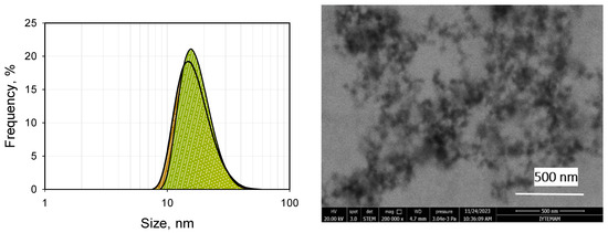 Thirdly, the hydrophobic cores of the micelles must be large enough to be able to contain enough smaller drug molecules, while being small enough to penetrate the target cells. Micelles of copolymers and natural polymers with sizes in the order of 10–100 nm perfectly satisfy these criteria. Some examples of direct measurements carried out in our labs are given in Figure 2 and Figure 3. The left-hand-side graph in Figure 2 gives the in situ dynamic light scattering size distribution of barren micelles of the well-known Pluronic® brand tri-block copolymer P-123 in distilled water. The figure shows that the micelles have an average size of around 18 and a maximum size of around 40 nm (DLS, dynamic light scattering). The average size observed agrees with the reported values in the literature [45,46]. A scanning transmission electron microscope (STEM) picture of the same micelles after immobilization on carbon grids is given in the right-hand-side graph of Figure 2. The image clearly shows the size and the spherical shape of the micelles. Scanning transmission electron microscope (STEM) images of the same micelles loaded with strongly hydrophobic drugs are presented in Figure 3.