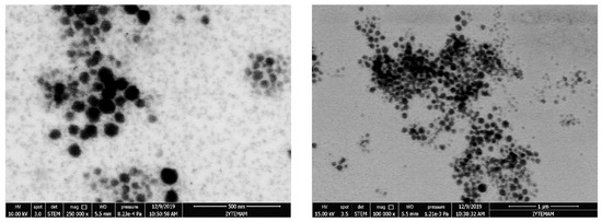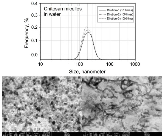 In Figure 6, STEM images clearly reveal the formation of spherical, non-porous chitosan micelles with diameters between 30 and 50 nm in aqueous media. Given the relatively high molecular weight of the modified chitosan (~500,000 g mol−1), these structures likely represent coiled aggregates of hydrophobically modified chitosan chains, possibly intercalated with drug molecules. This self-assembly behavior contrasts with more conventional polymeric micelles such as those formed from Pluronic P-123, which typically exhibit smaller diameters (~20 nm) (Figure 2 and Figure 3).