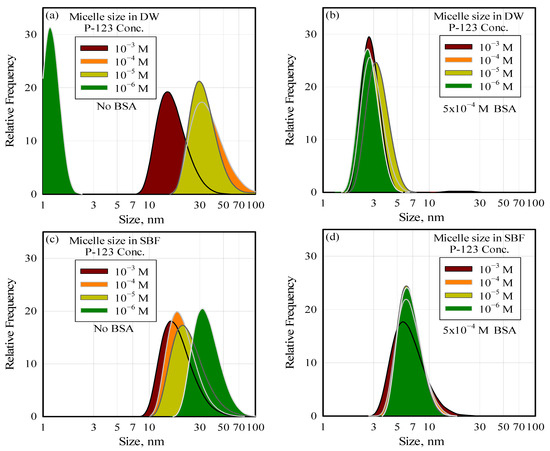 Their more recent work conclusively demonstrates that native plasma components (in this case, the protein BSA) significantly affect micelle integrity. The graph on the left-hand side of Figure 4 shows how micelles are affected by BSA in solution. It can be observed that the average micelle size of 18 nm, in the absence of BSA, decreases with dilution, reaching less than 3 nm at a BSA concentration of 5 × 10−4 M. BSA-induced micelle disintegration also cannot be prevented in SBF or in the presence of encapsulated lipophilic drug molecules [47]. It should be noted that the BSA concentration at which the micelles disintegrate is within the range of the plasma protein concentration. It is suggested that dilution and the presence of native plasma components must be considered in devising micelles as drug carriers.