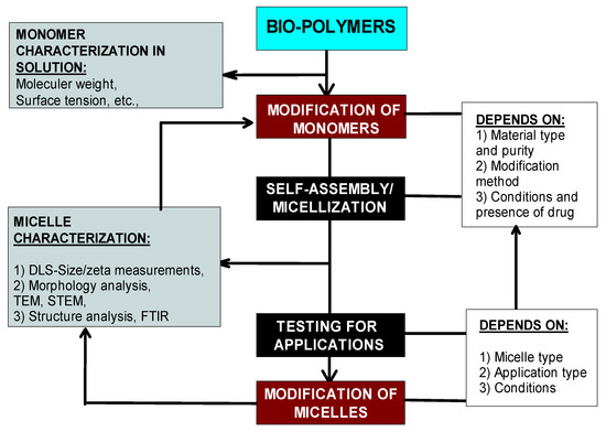 Specifically, biopolymers in their natural form are not suitable for self-assembly; micelle formation requires assistance through the chemical modification of biopolymer molecules to obtain hydrophobic functional groups. Once they are made to self-assemble, biopolymeric micelles present great potential for controlled release, drug targeting, and hydrophobic active material solubilization with the added advantage of intrinsic biocompatibility and biodegradability, which is always a question with synthetic polymers. The important steps/factors involved in their modification and micellization is generalized by the following flowsheet (Figure 5).