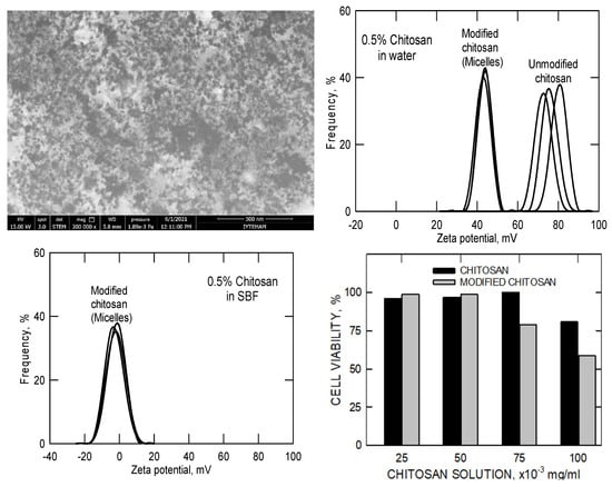 STEM pictures, zeta potentials, and biocompatibility results of the unmodified (pristine) and modified (hydrophobisized) chitosan molecules in water and in simulated body fluid. (The multiple black lines represent 3 repeats of the same measurements).