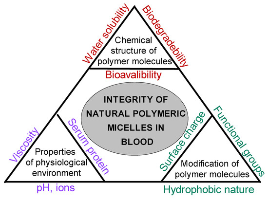 The possible factors, such as chemical structures of molecules, properties of the physiological environment, and the modification type of molecules, that affect the integrity of natural polymeric micelles in blood are summarized in Figure 7. In particular, hydrophobically modified chitosan systems benefit from cooperative hydrophobic association within the shell/core network, whereas classical block-copolymer micelles remain governed by core–corona equilibrium near the CMC.