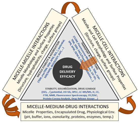 Once micelles are formed, further characterization is required to determine their morphological and surface properties. In addition to the aforementioned techniques, specialized tools such as small-angle X-ray scattering (SAXS), dynamic light scattering (DLS), atomic force microscopy (AFM), scanning electron microscopy (SEM), transmission electron microscopy (TEM), and scanning transmission electron microscopy (STEM) are routinely used for comprehensive micellar characterization [239].